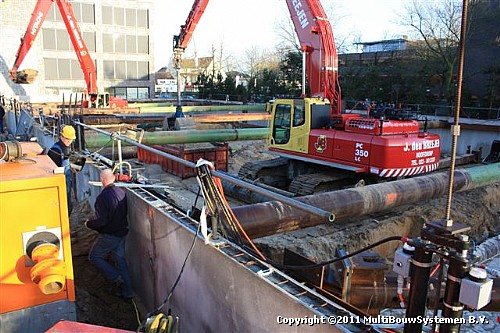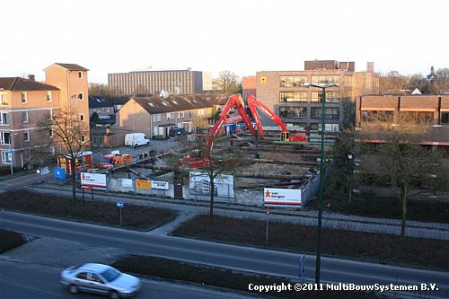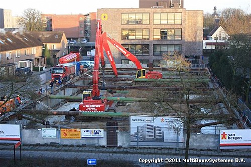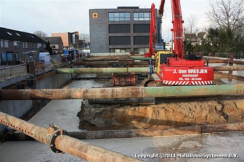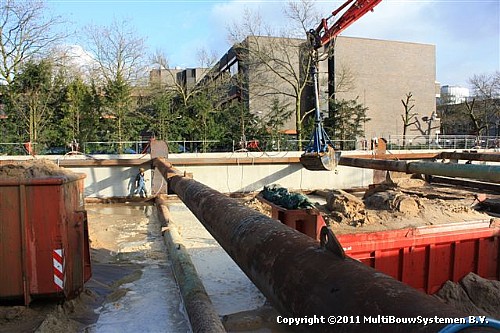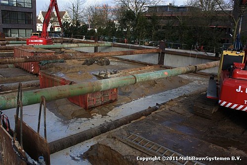Nat afgezonken kelder in Oss van 60 x 26 x 4 meter. Onderwater is een betonvloer gestort: geen damwanden, geen bemaling, geen risico’s en geen trillingen!