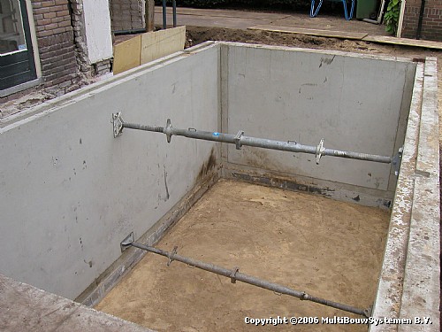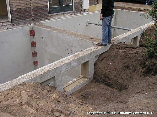 In Baarn hebben we achter een dubbel woonhuis een dubbele kelder in één keer afgezonken. Vanuit de bestaande kelder wordt een doorgang gemaakt in de nieuwe kelders. De deursparing wordt er na het afzinken ingezaagd.