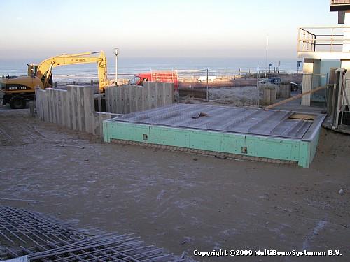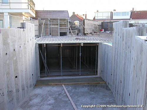 Aan de Boulevard in Zandvoort hebben wij een afzinkkelder geplaatst. Het terras van de buren is niet onderheid maar de kelder is er zonder problemen strak naast afgezonken. Het droge duinzand heeft de neiging om als water weg te lopen maar het snijmes aan de onderzijde van de wanden voorkomt het weglekken van zand.