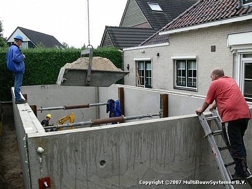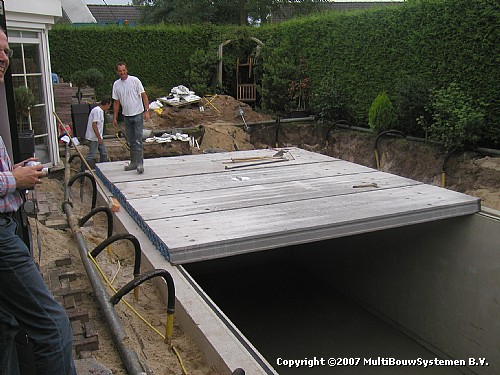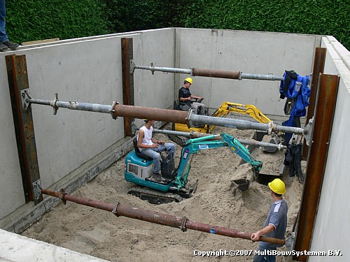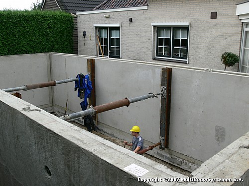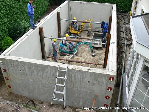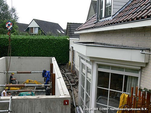 In een achtertuin in Hardewijk zinken wij strak tussen de heg en de bestaande woning een hobbykelder van formidabele afmetingen de grond in.