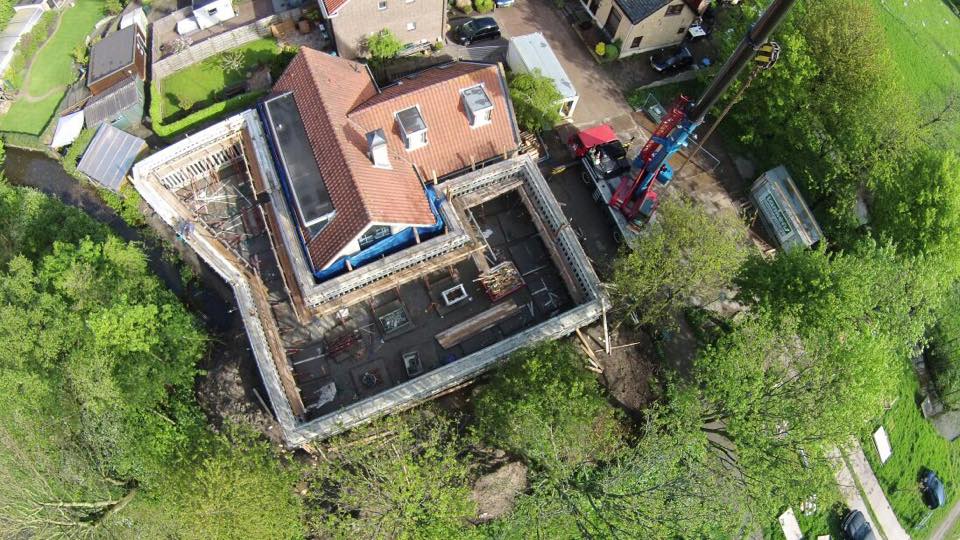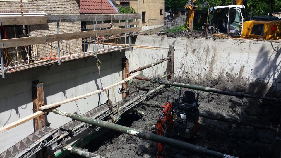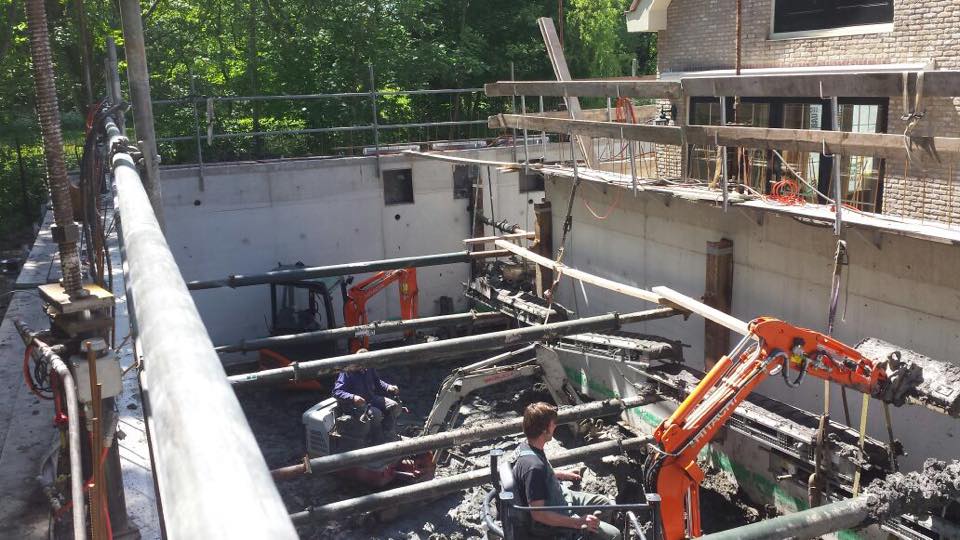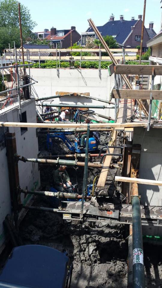 Voor aannemer Tankens uit Andel mochten wij in Pernis een grote afzinkkelder plaatsen. Deze kelder is bijna rondom de bestaande woning gevouwen. De slappe klei en de woning die niet op heipalen staat maken dit project spannend.