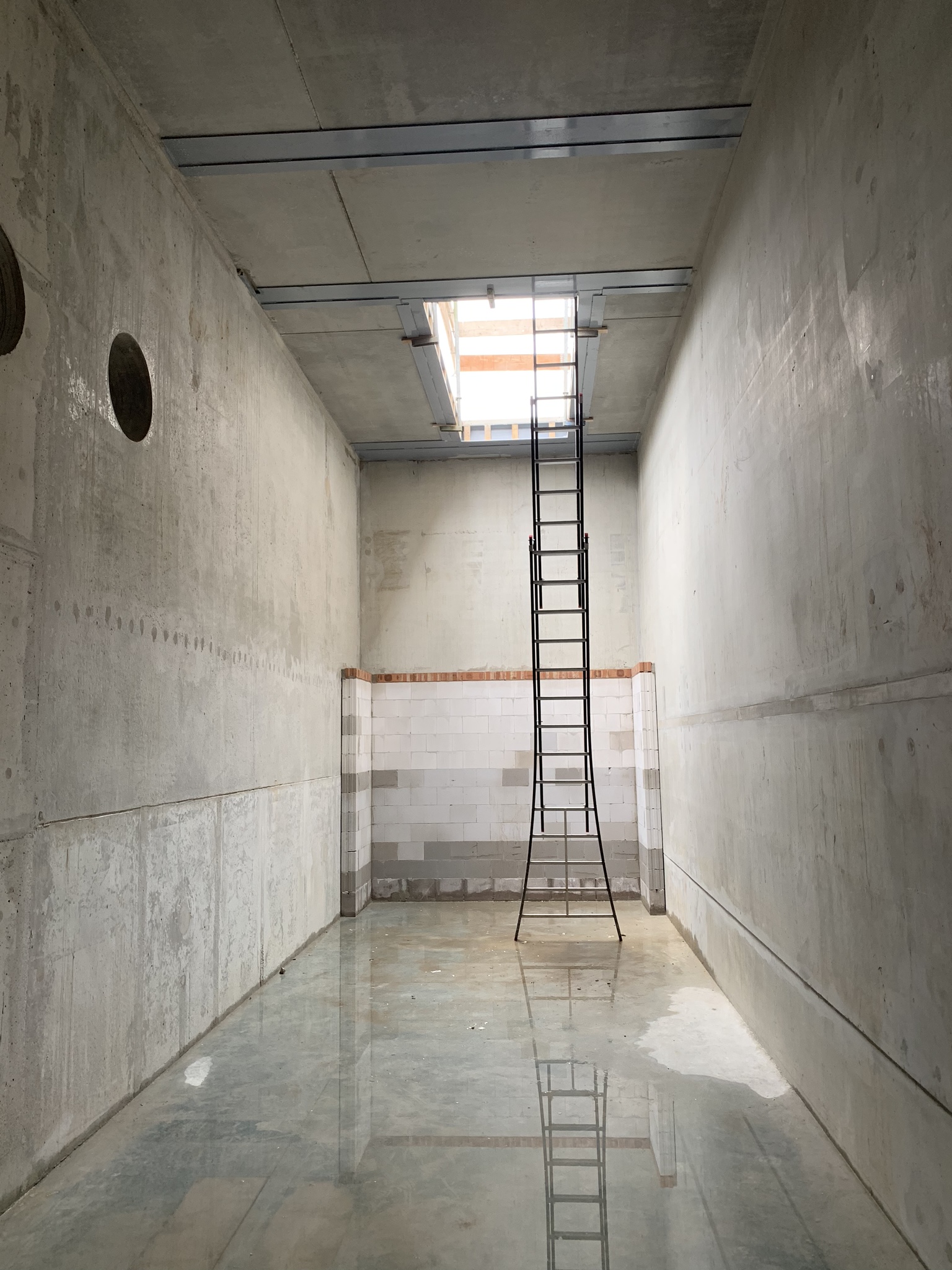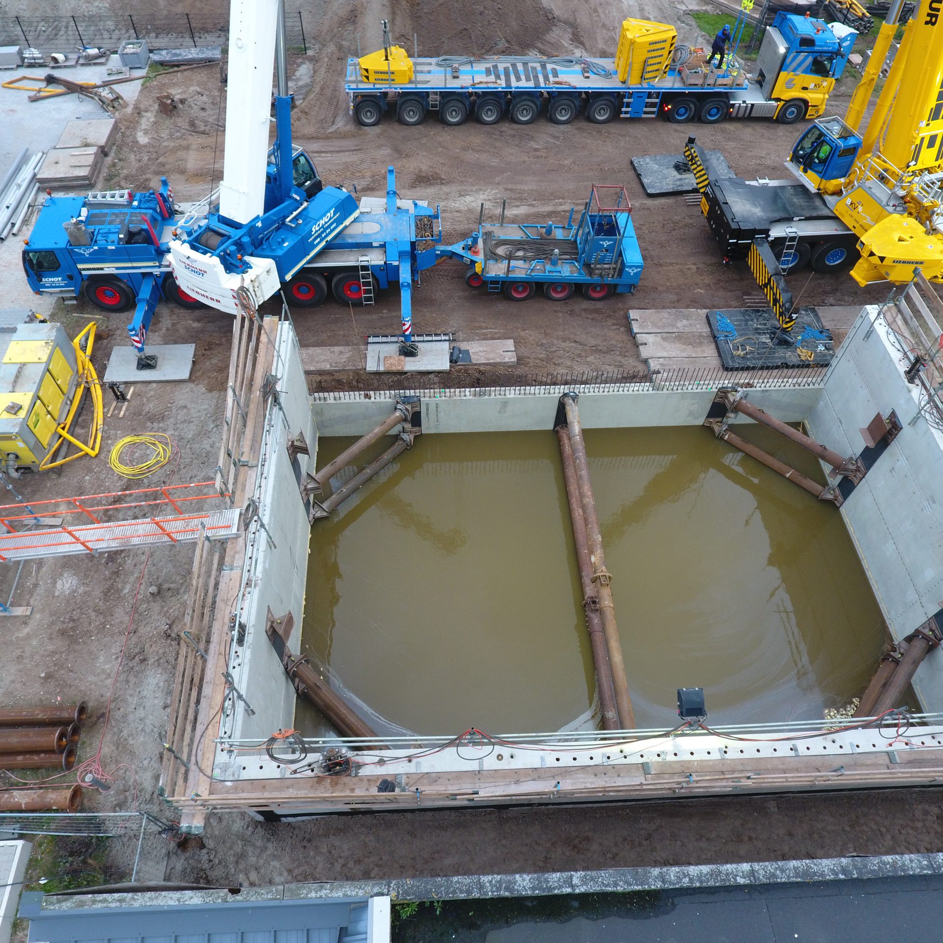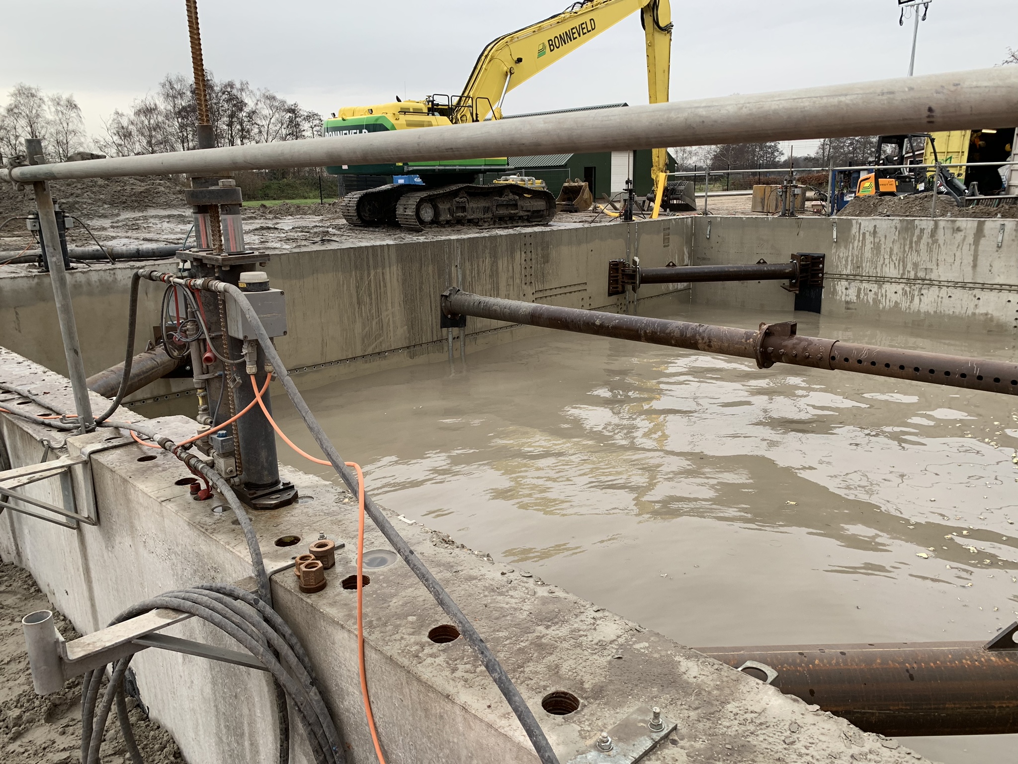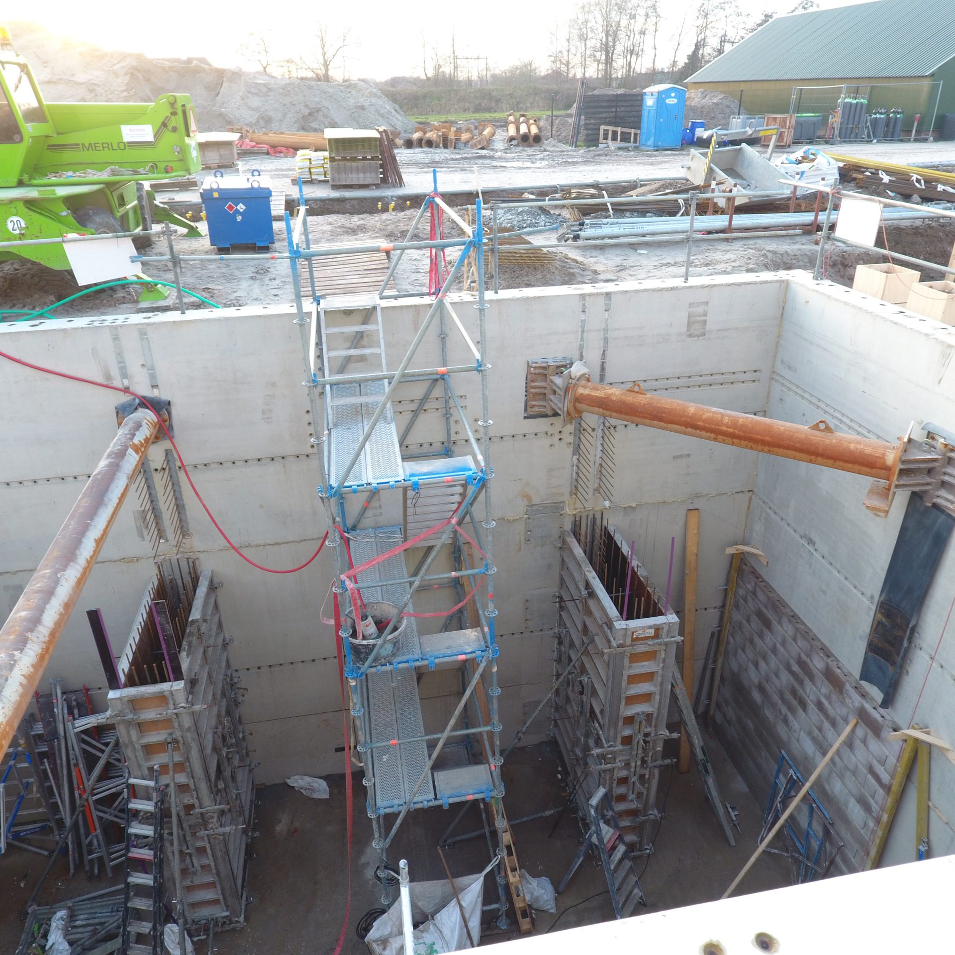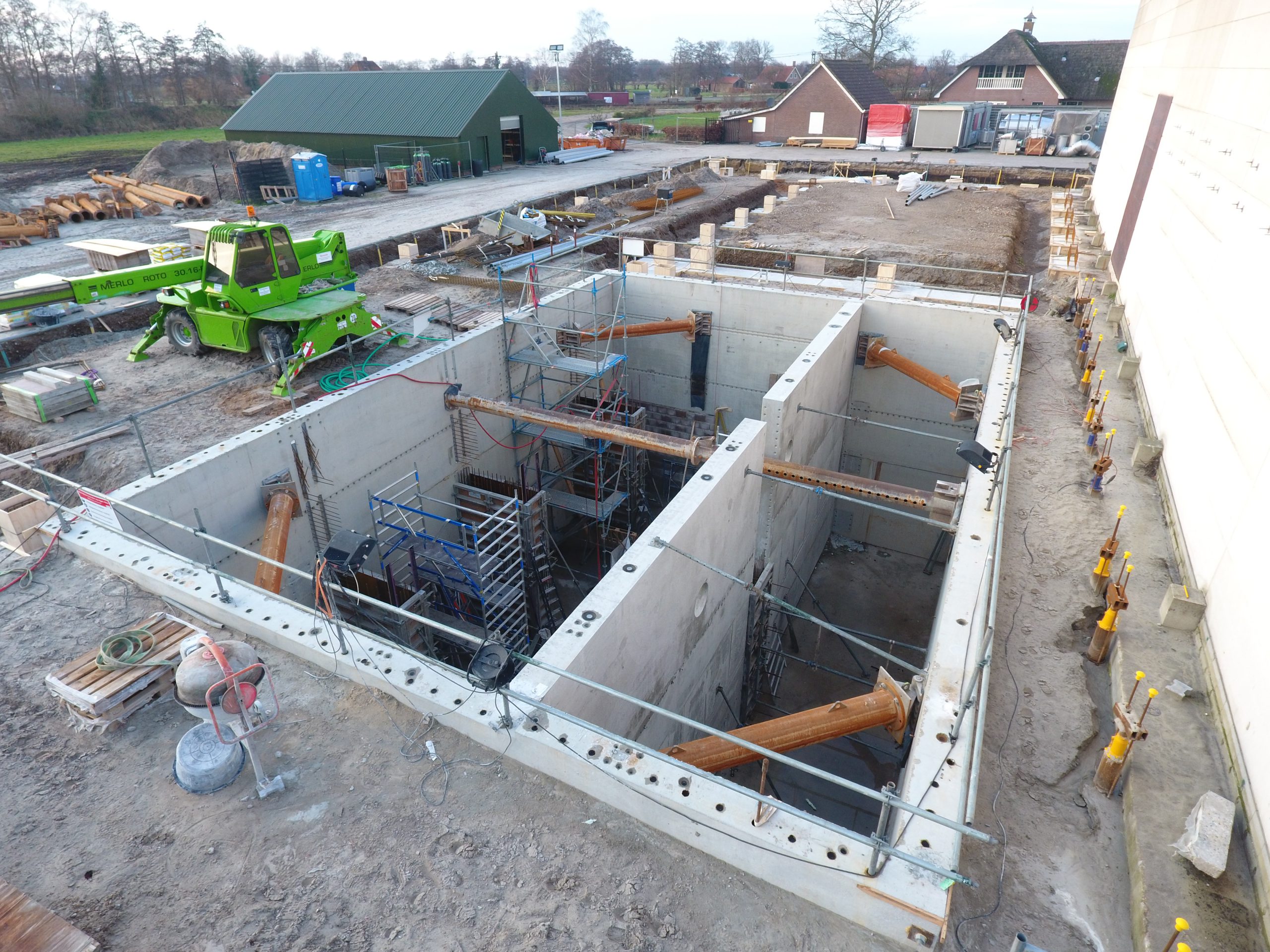 Deze kelder van 12x16x9 m is direct naast een bestaande strokenfundering gerealiseerd. Om opdrijven te voorkomen zijn onderwaterbeton en verticale grondankers aangebracht. Aannemersbedrijf G.G. Aalten is de hoofdaannemer.