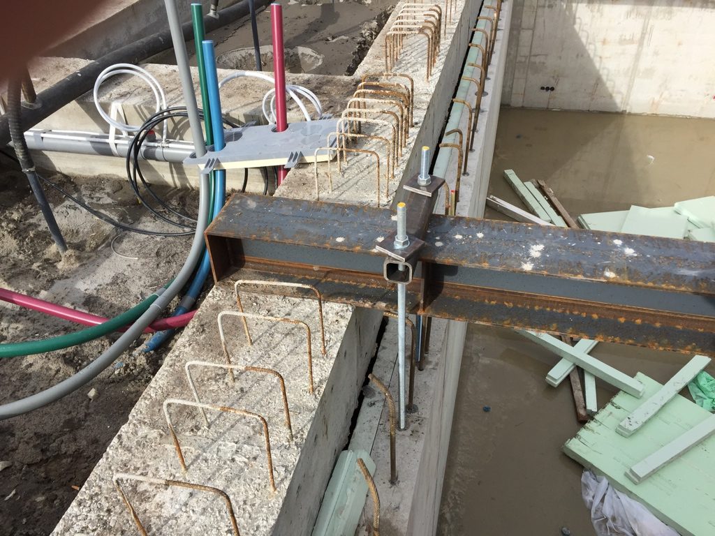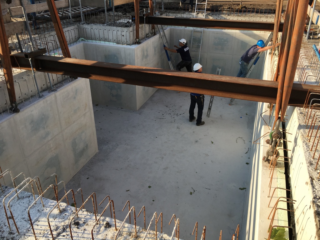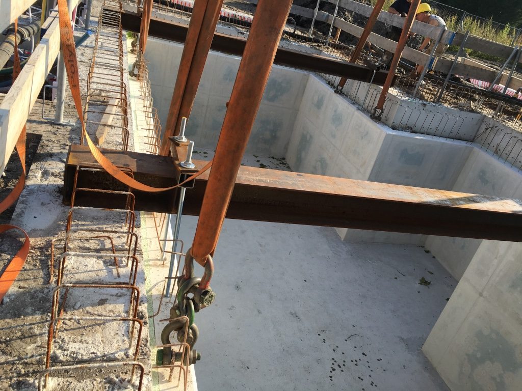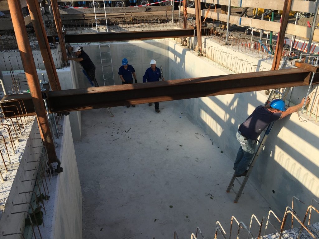 Onder de bovenloopkranen kunnen de zware pijpen gemakkelijk in de kelderbak gehesen worden.
