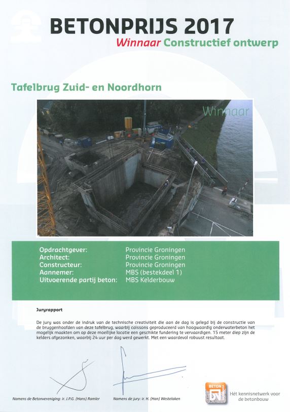 CELLA Kelderbouw wint met project caissons tafelbrug Zuid- en Noordhorn de Betonprijs 2017 in de categorie ‘Constructief ontwerp’.